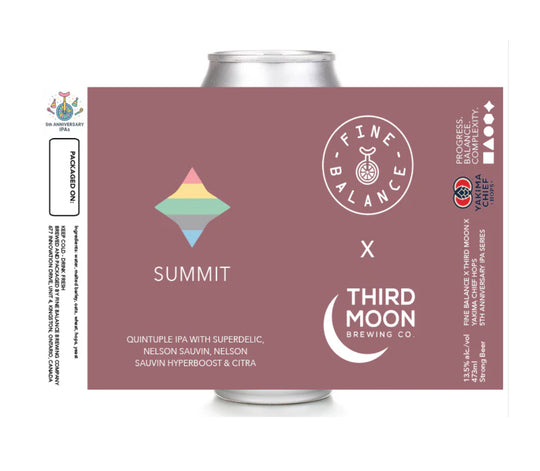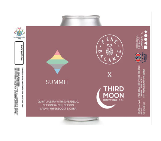 The final release in our fifth anniversary IPA series is the biggest beer we've ever done. Inspired by our good friends at Third Moon, Summit is our first ever quintuple IPA. Brewed with a huge amount of Superdelic, Nelson Sauvin, Nelson Sauvin Hyperboost, and Citra, we're getting notes of pithy orange, grapefruit and white wine grape.