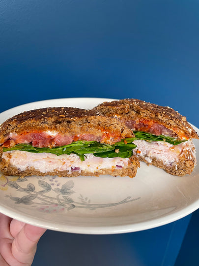 Smoked Chicken, Spinach, Tomato, Red Onion, Sun Dried Tomato Pesto, Roasted Garlic Mayo, Goat Cheese
